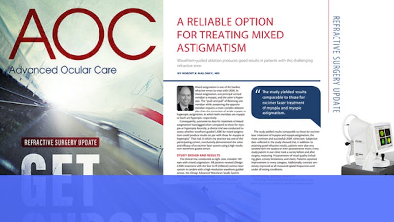 Consequently, outcomes to date for treatment of mixed astigmatism have lagged when compared to those for myopia or hyperopia. Recently, a clinical trial was conducted to assess whether wavefront-guided LASIK for mixed astigmatism could produce results on par with those for myopia or hyperopia.1 That trial, in which my practice was one of the participating centers, conclusively demonstrated the value and efficacy of an excimer laser system using a high-resolution wavefront guided sensor.